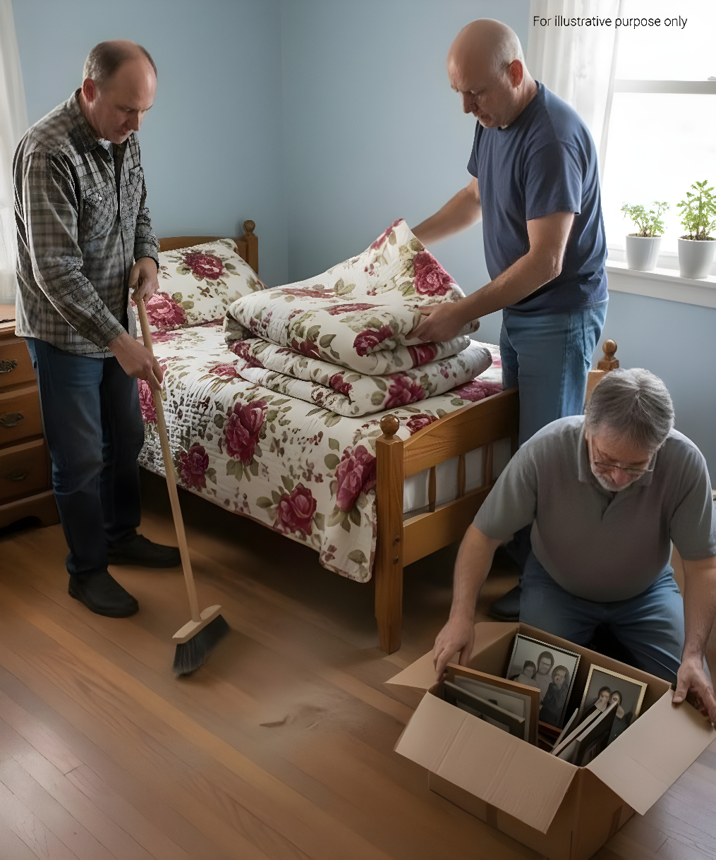 Funérailles modestes : mes deux frères aînés et moi-même — le frère aîné, le deuxième frère et moi — nous sommes rassemblés pour discuter de la répartition des rares possessions restantes.