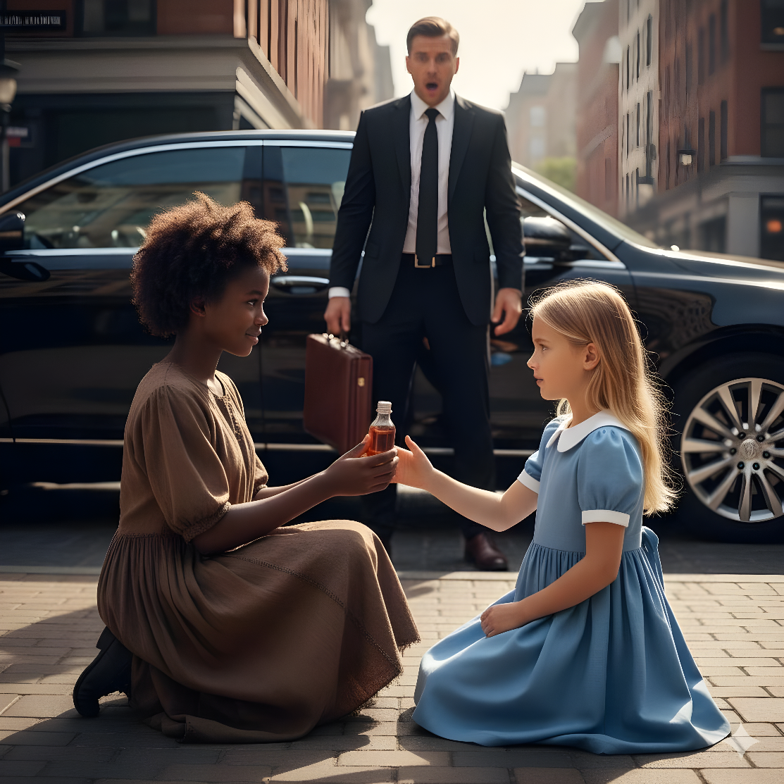 De l’autre côté de la place, une fillette de son âge se tenait là. Sa peau sombre brillait de sueur, ses habits étaient usés et déchirés, ses pieds nus salis par la poussière. Dans ses mains tremblantes, elle tenait un petit flacon en verre contenant un liquide épais, doré. Malgré son apparence, une détermination profonde habitait ses yeux, comme si elle protégeait un trésor inestimable.