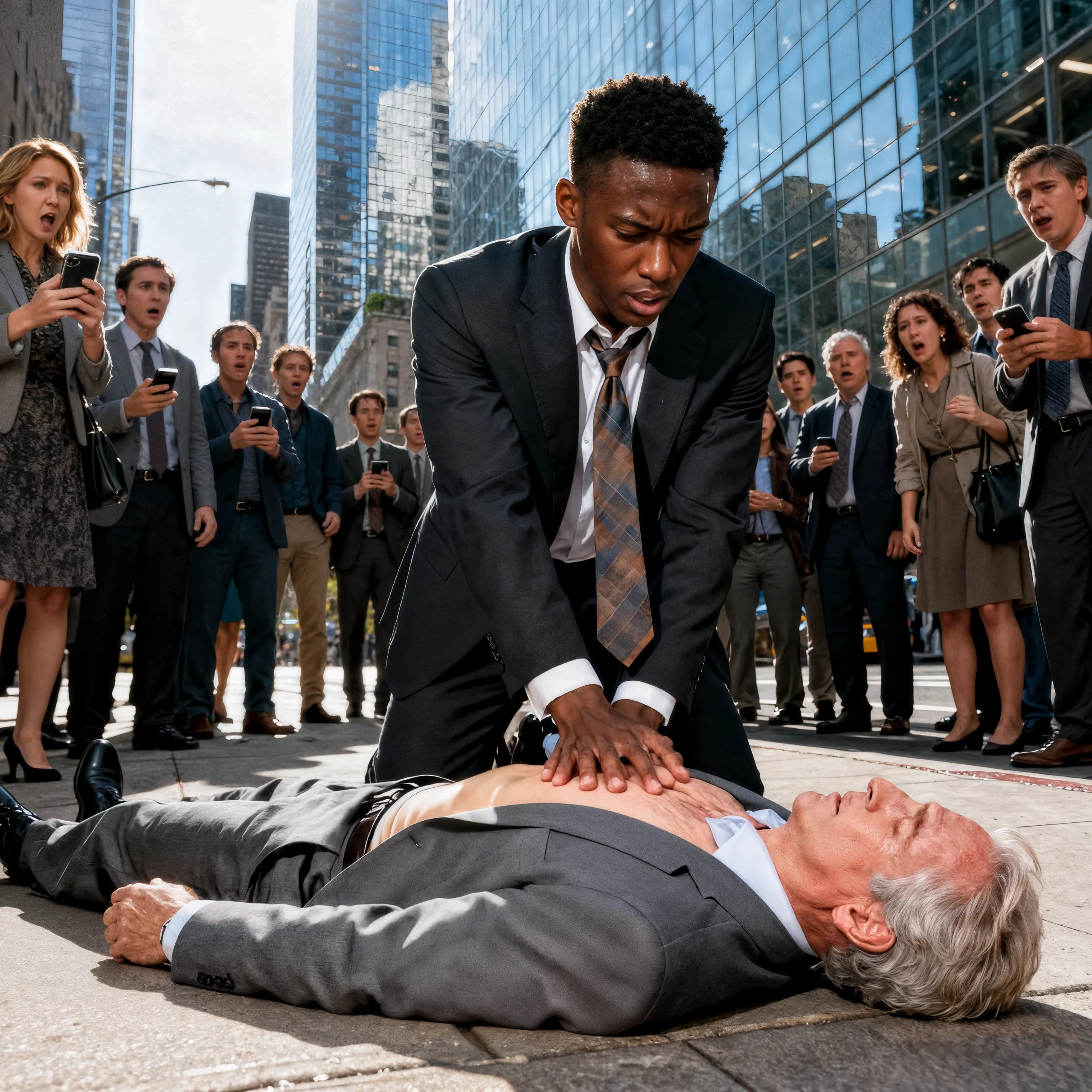 Un homme âgé, vêtu d’un costume gris, s’était écroulé sur le trottoir. Les passants étaient figés, certains appelaient à l’aide tandis que d’autres sortaient leur téléphone, mais personne n’intervenait. Sans hésiter, Marcus abandonna sa mallette et courut vers lui.
