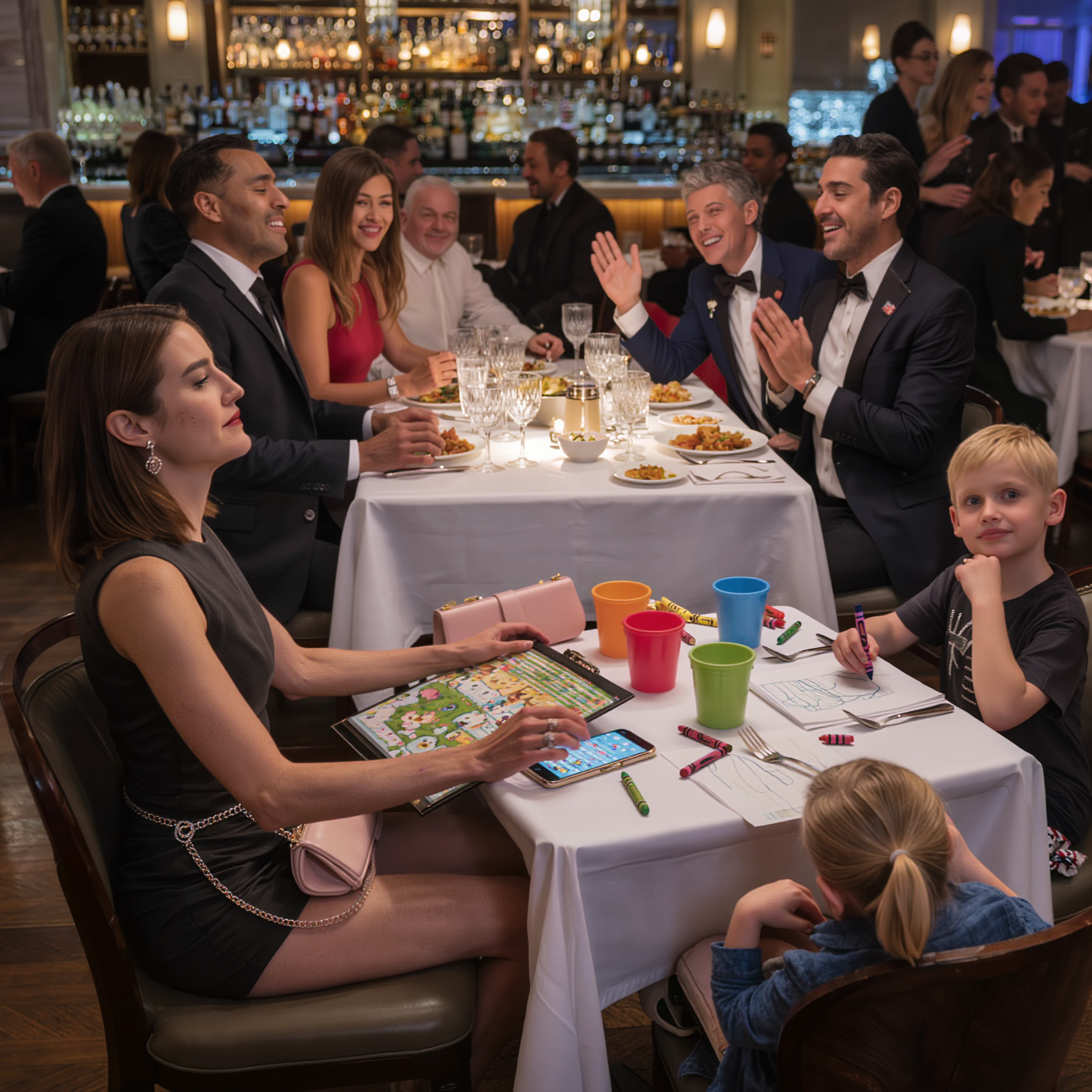 Je jetai un coup d’œil à la table dans le coin. Mon neveu Tyler, âgé de huit ans, y était déjà assis, balançant ses jambes et jouant à un jeu sur sa tablette. À côté de lui, ma nièce Sophia, qui venait d’avoir six ans. La table était dressée avec des gobelets en plastique ornés de personnages de dessins animés.